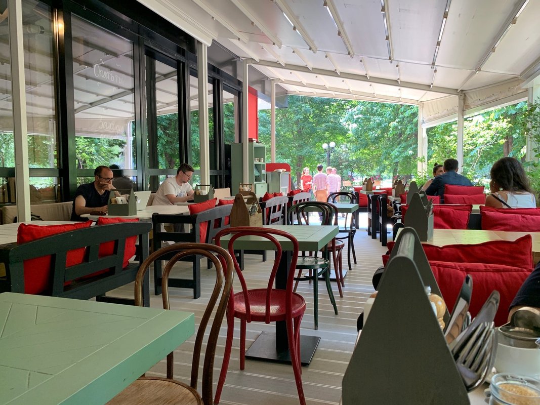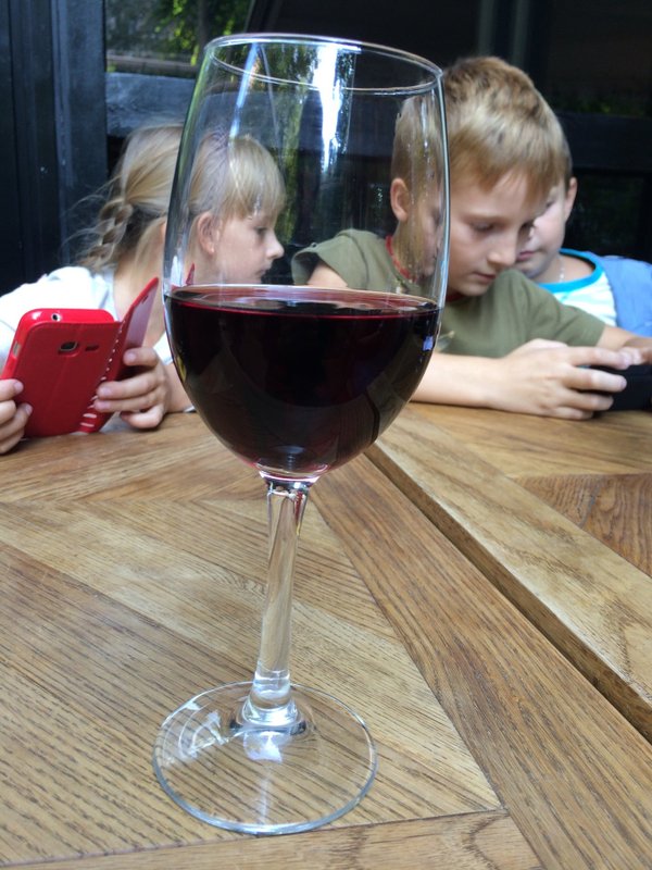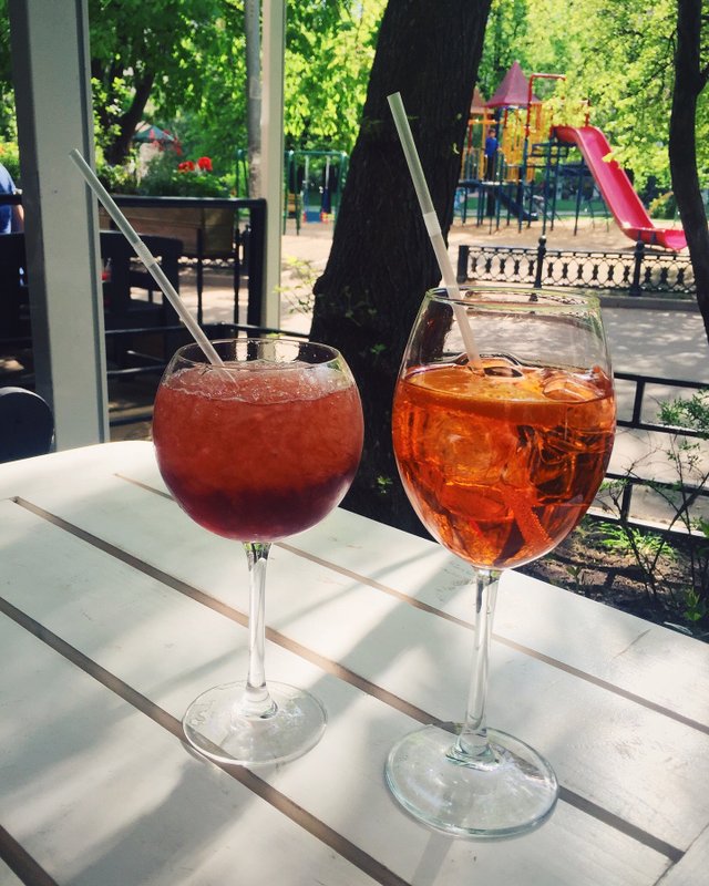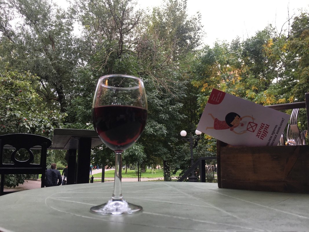 По-европейски благостная атмосфера + смех с детской площадки = все улыбаются, позвякивая приборами. Ну и естественно вкусно всё %) Хачапури ж!